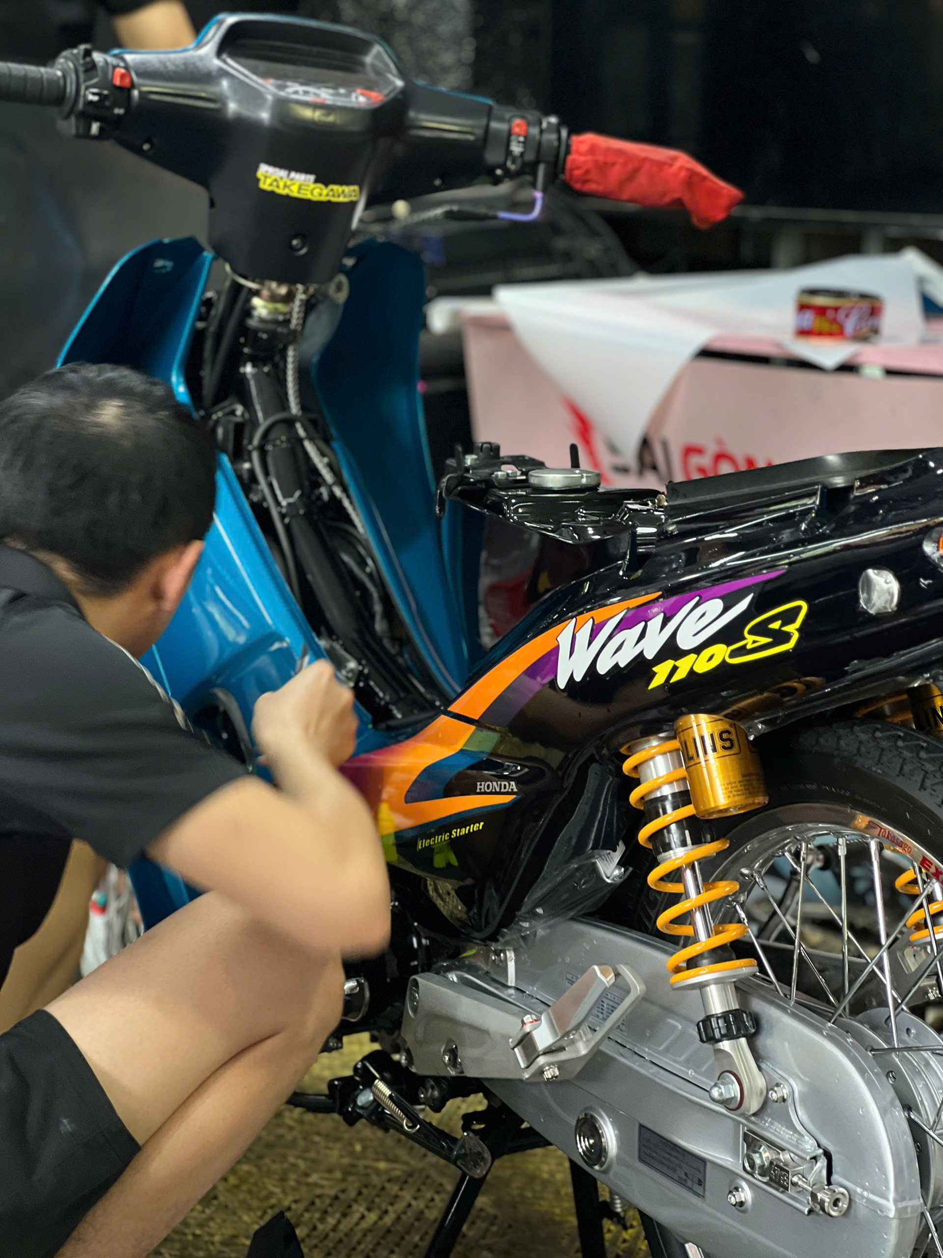 Sau khi vệ sinh bề mặt, kỹ thuật viên sẽ tiến hành cắt keo PPF TPU sao cho phù hợp với các bộ phận trên chiếc Wave S 110. Lớp phim sẽ được cắt theo kích thước chính xác của từng phần xe để đảm bảo độ bảo vệ tối ưu mà không gây mất thẩm mỹ.