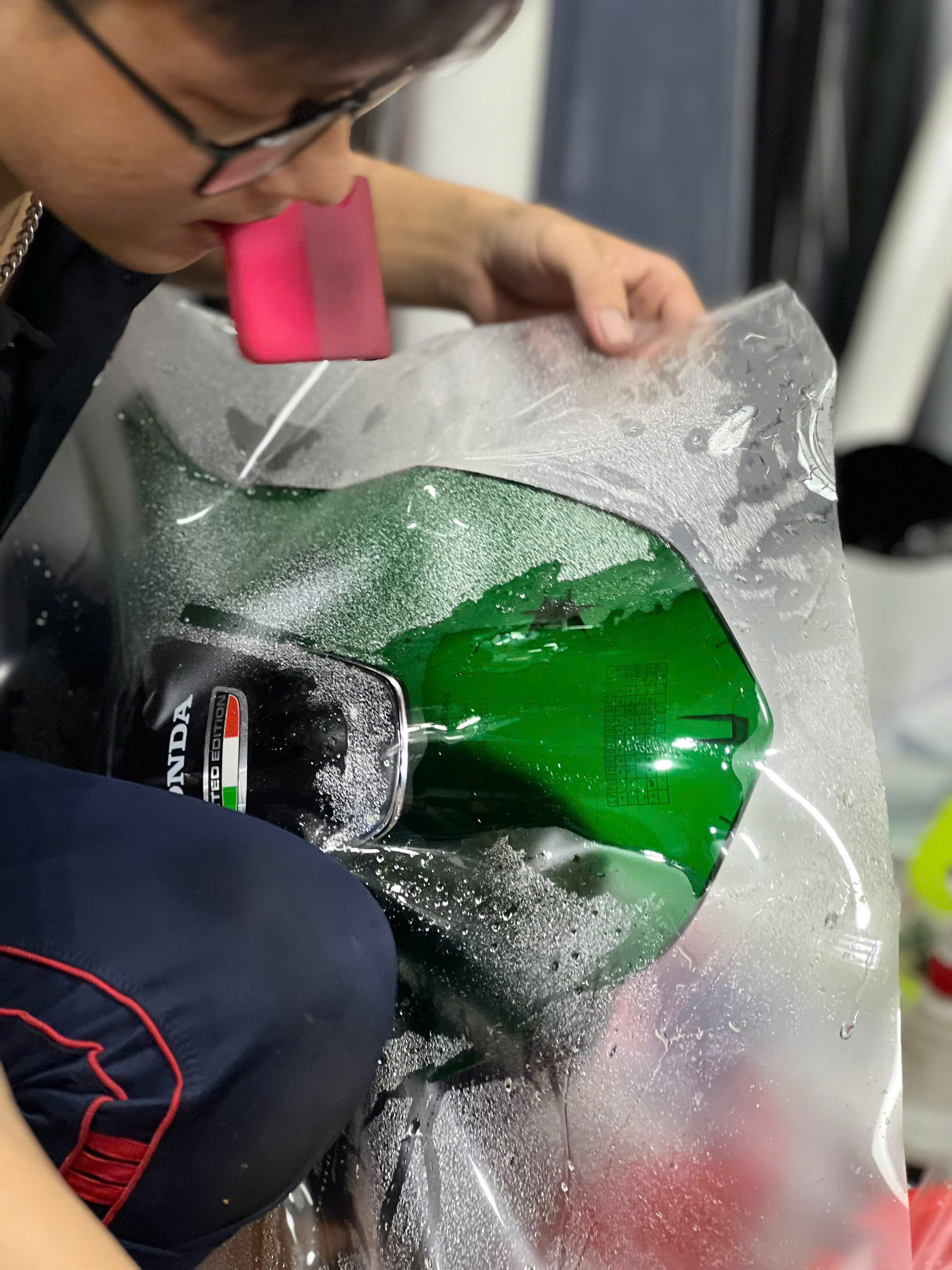 - Dán keo: Các kỹ thuật viên tiến hành dán lớp keo lên bề mặt xe một cách cẩn thận, loại bỏ bọt khí và vết nhăn.