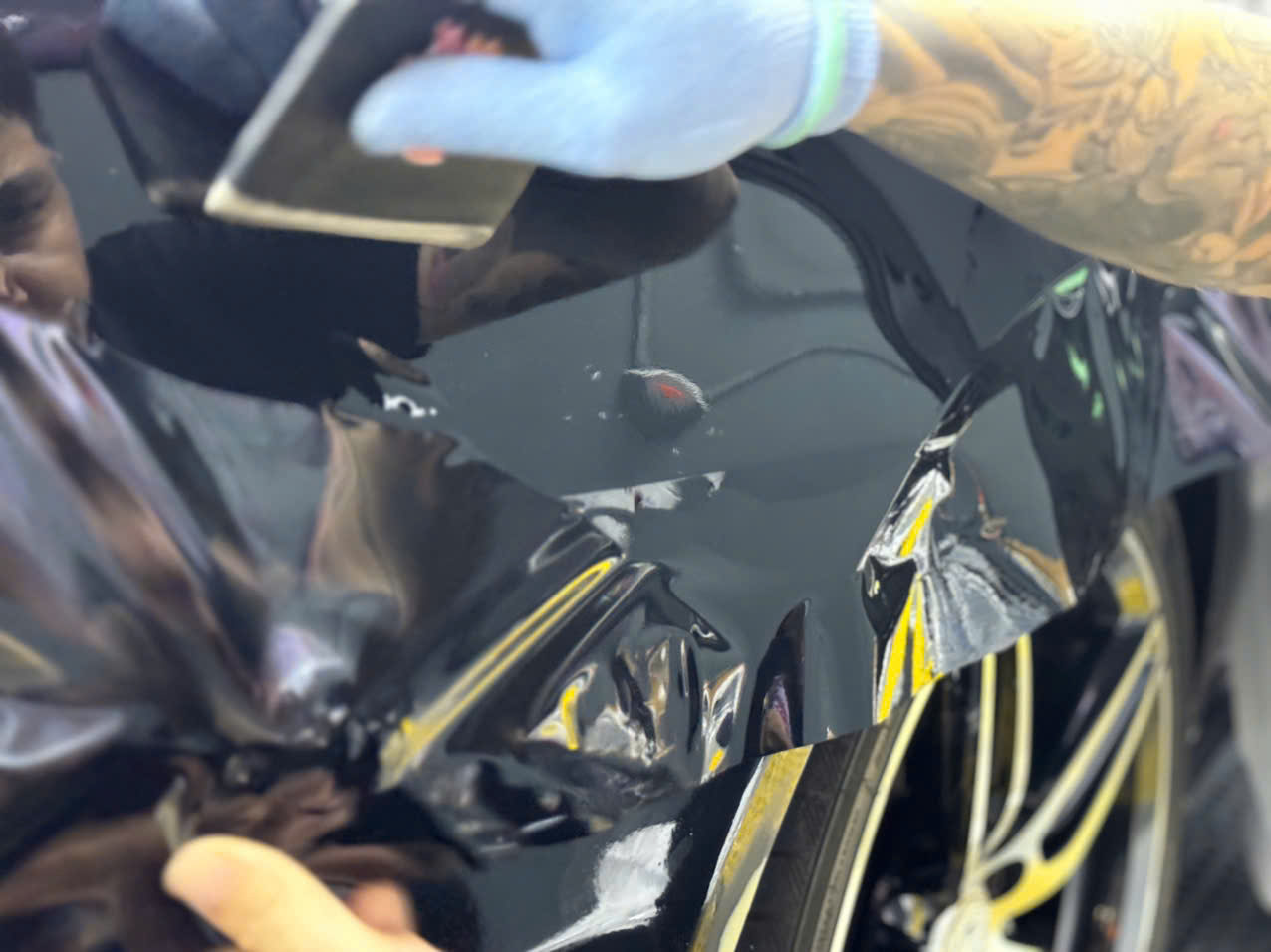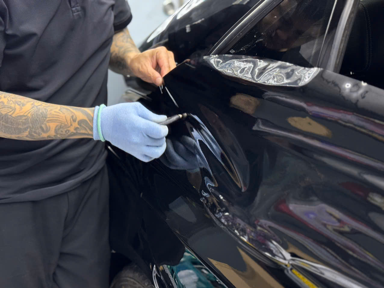 • Chuẩn bị bề mặt dán: Sau khi làm sạch, các chi tiết như tay nắm cửa, gương, logo hoặc các bộ phận nhỏ khác sẽ được tháo rời hoặc che chắn để dán chính xác hơn.